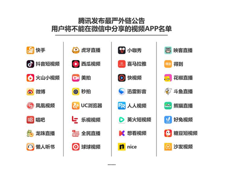 这就把线下抖音、秒拍等一众途径包含在内,可谓是一场全网的“一致封杀”举动,随后,一张“腾讯发布最严外链公告”的图片在网络上撒播。在这张图上,除了腾讯旗下自己的短视频途径微视之外,其他你了解的面孔基本上都将因而遭受微信“封杀”。这可谓是公开了本来背后的“潜规矩”而做了一次亮剑——